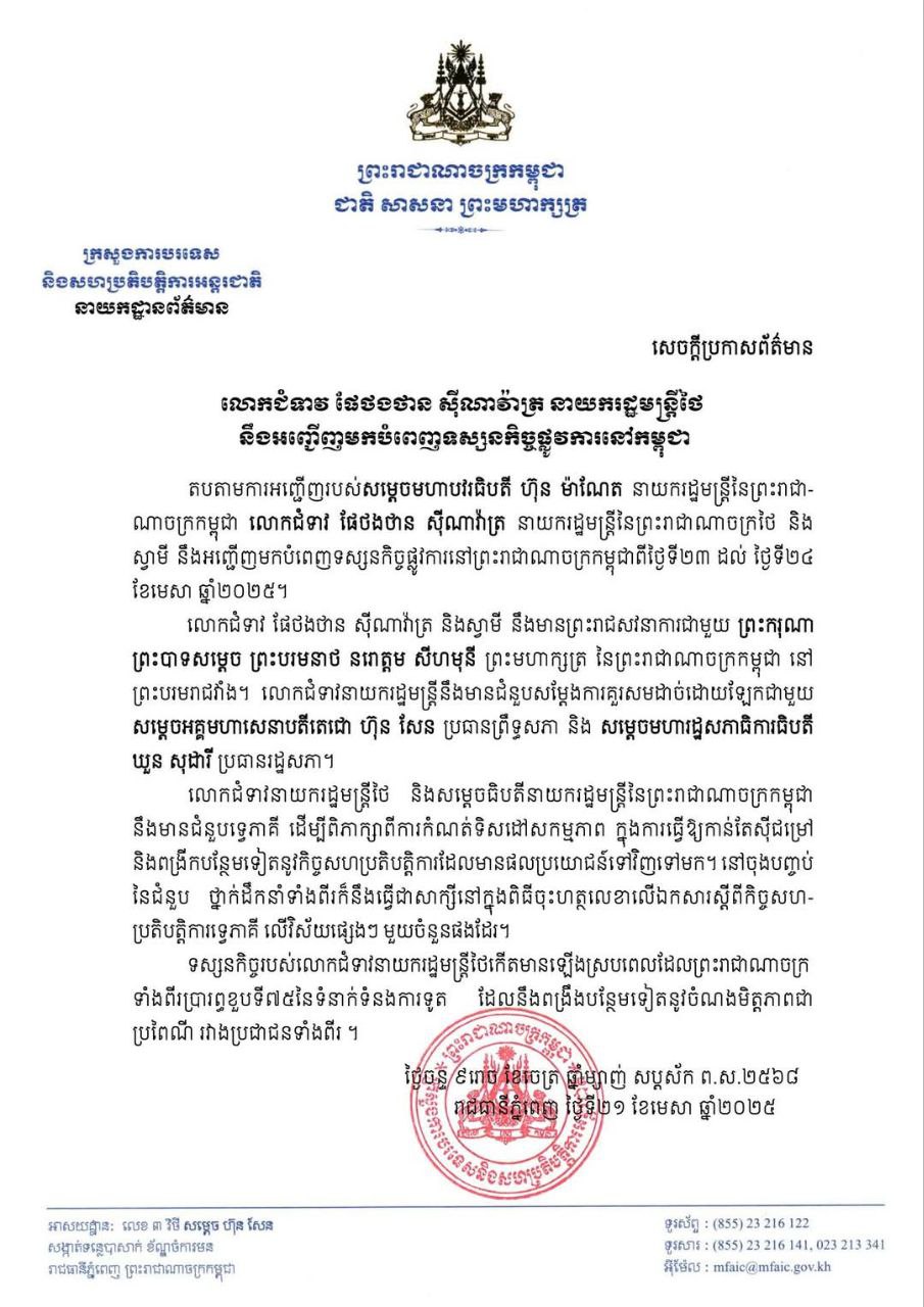 នាយករដ្ឋមន្ត្រីថៃ និងសម្តេចធិបតីនាយករដ្ឋមន្ត្រីនៃកម្ពុជា នឹងមានជំនួបទ្វេភាគី ដើម្បីពិភាក្សាពីការកំណត់ទិសដៅសកម្មភាព ក្នុងការធ្វើឱ្យកាន់តែស៊ីជម្រៅ និងពង្រីកបន្ថែមទៀតនូវកិច្ចសហប្រតិបត្តិការដែលមានផលប្រយោជន៍ទៅវិញទៅមក។ នៅចុងបញ្ចប់នៃជំនួប ថ្នាក់ដឹកនាំទាំងពីរក៏នឹងធ្វើជាសាក្សីនៅក្នុងពិធីចុះហត្ថលេខាលើឯកសារស្តីពីកិច្ចសហ ប្រតិបត្តិការទ្វេភាគីលើវិស័យផ្សេងៗ មួយចំនួនផងដែរ៕ស្វាសរ
